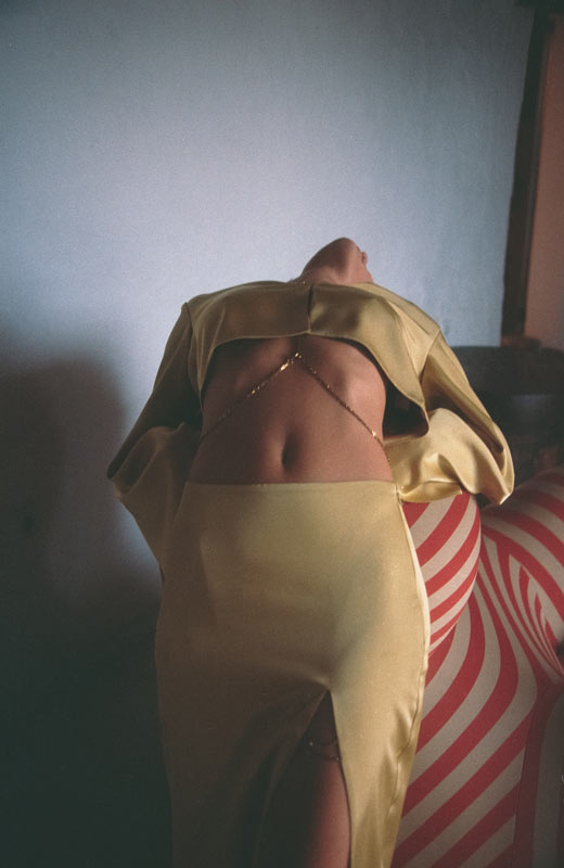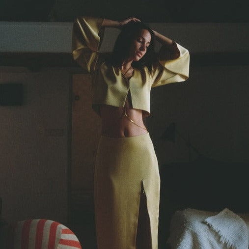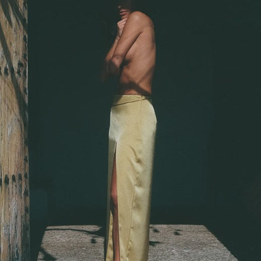Pour des vacances à Tulum, JERA est un ensemble léger couleur or, composé d'une jupe longue fendue et d'un haut évasé, accompagné d'une chaîne libre à disposer et composer à votre convenance.