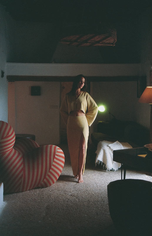 Sa coupe fendue et les attaches en chaînes au niveau de la fente souligne subtilement les jambes.
