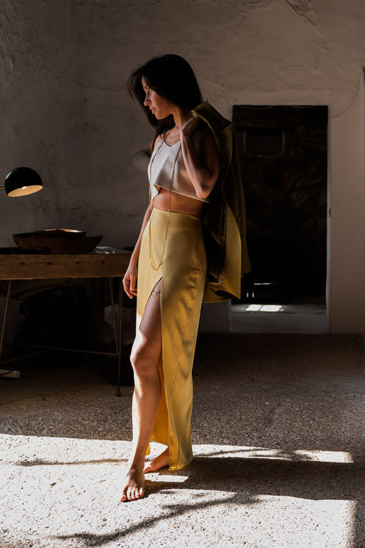 La Jupe longue or JERA sublimera vos jambes grâce à son ouverture ornée de petites chaînes tombantes.