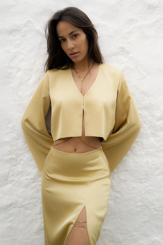 Le haut court JERA est le complément parfait à la jupe JERA. Cet ensemble est associé à une chaîne libre permettant de jouer avec les différentes possibilités de positionnement pour personnaliser votre tenue.