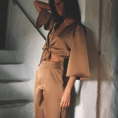 Découvrez Berkana, notre haut bronze court attaché par un nœud, offrant un décolleté subtilement orné d'une attache en chaîne. Berkana est fabriqué avec des matériaux de qualité supérieure, sélectionnés avec soin pour leur douceur et leur confort.