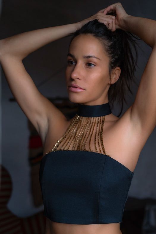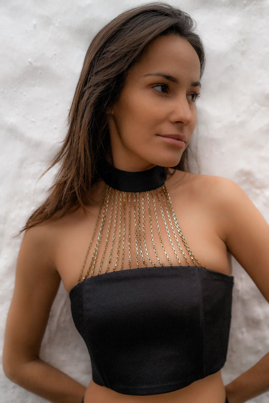 Le Haut court FEHU de Maison Paolina a été conçu pour mettre en valeur le buste et le cou de chaque femme. Son collier de chaînes de son attache au cou jusqu'au bustier soulignera délicatement votre poitrine.